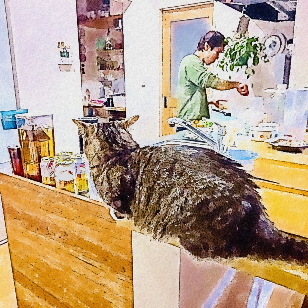 そんな夫のクッキングタイムを応援しているのは妻だけではないようで、我が家のお猫さん🐱 妻がキッチンでお料理している時はシンクの上やコンロ横でぴったりマークしているのに対し、夫のお料理する時はそっと離れたところから見守っているのでびっくり 空気を読むお猫さんにも感謝です
